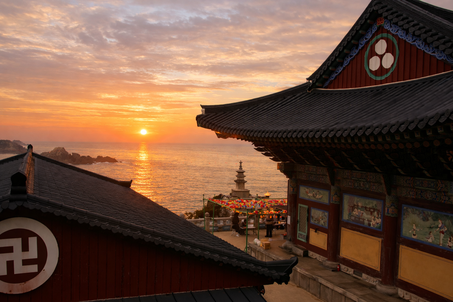 일출 사진은 ‘사찰의 기와지붕과 바다 수평선’을 동시에 넣으면 예뻐요. 바다를 내려다보는 난간 구간에서 전각 지붕선이 프레임에 들어오도록 하면 어떨까요.