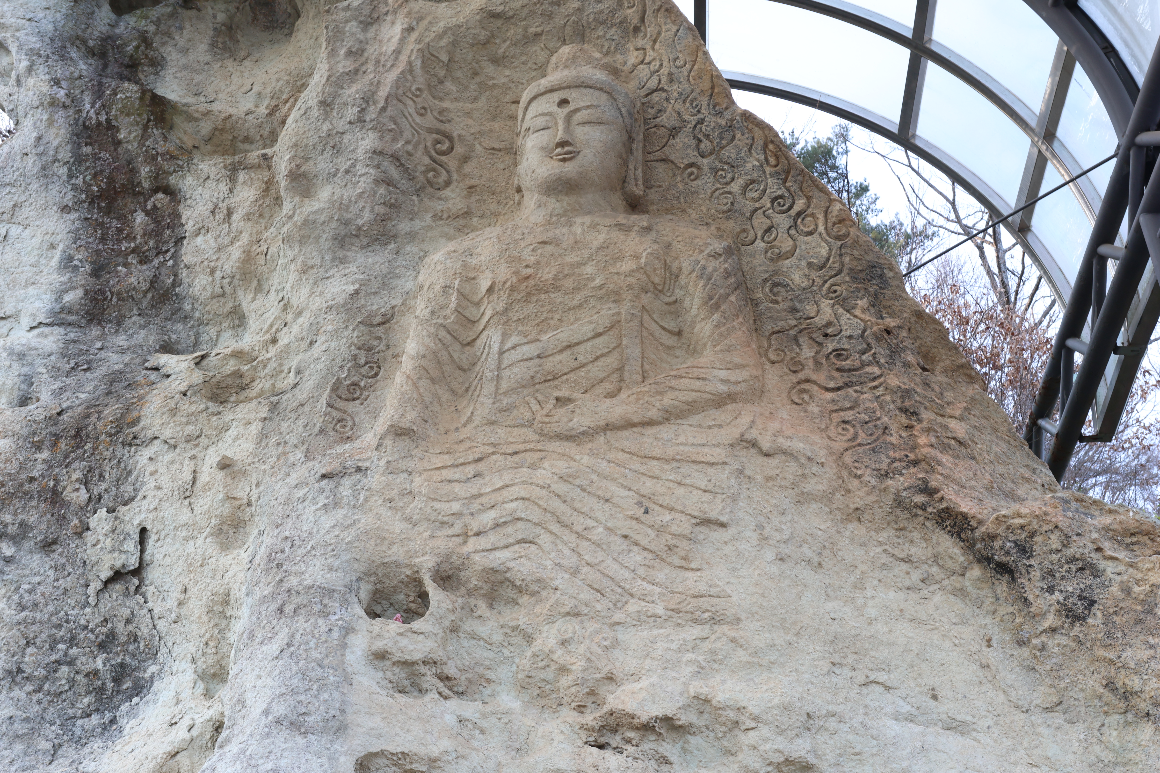 이곳 높은 암벽에는 경주 골굴암 마애여래좌상이 자리하고 있습니다.