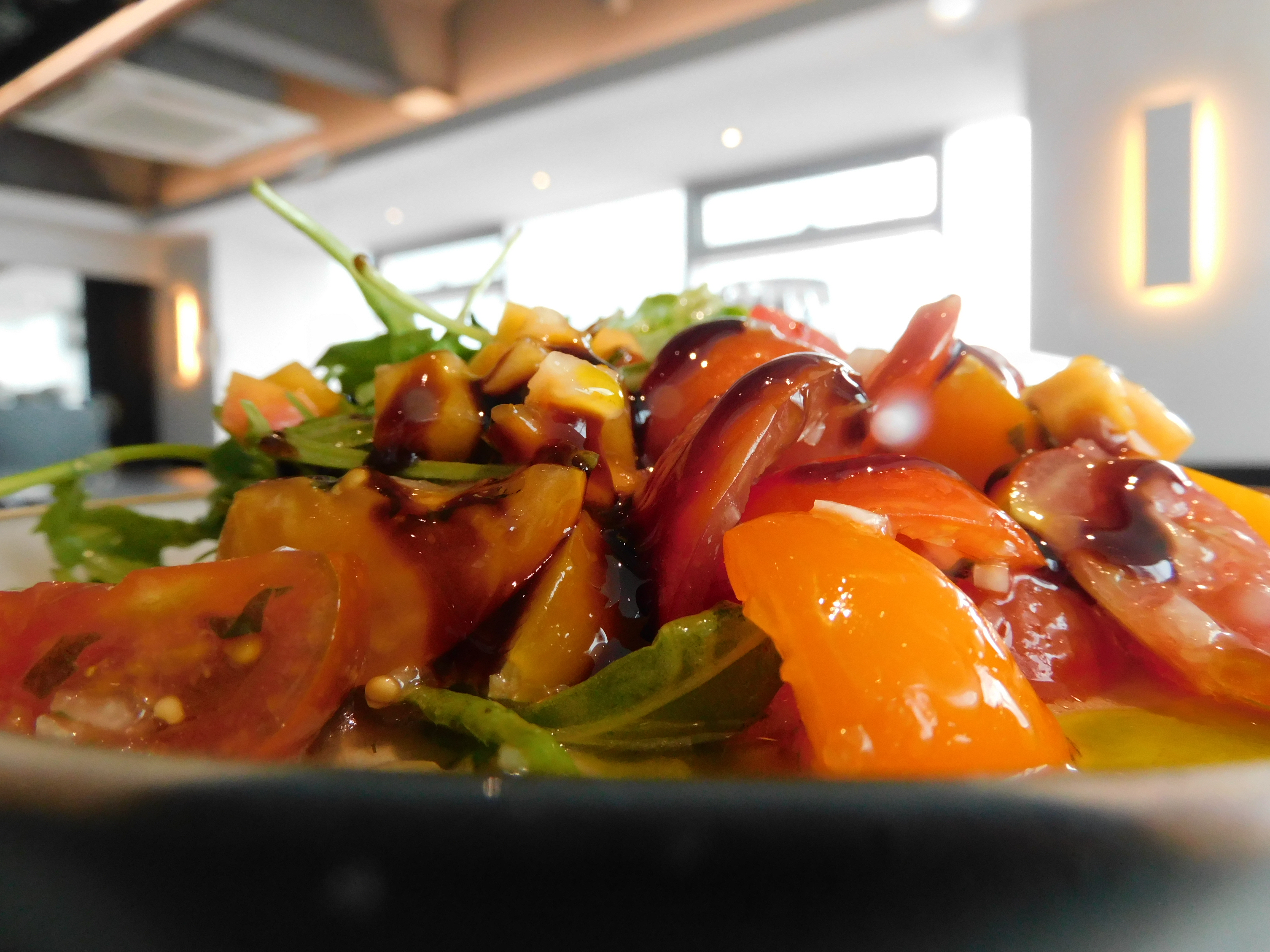 루꼴라 토마토 샐러드에는 복숭아와 자두를 아주 잘게 깍둑썰기해서 올려 두었는데 이 녀석들 씹히는 맛이 꽤 좋아요.